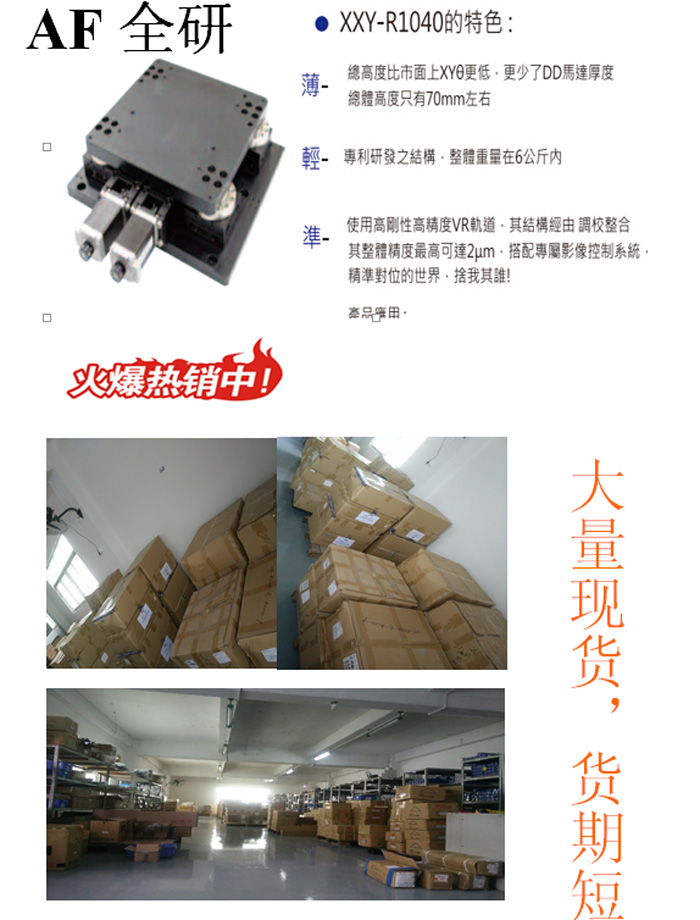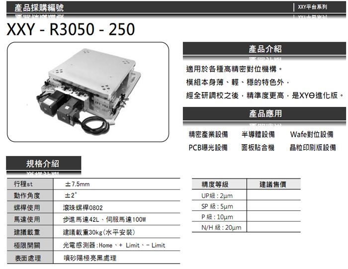 適用於各種高精密對位機構。模組本身薄、輕、穩的特色外,經調校之后,精准度更高,是XYθ進化版